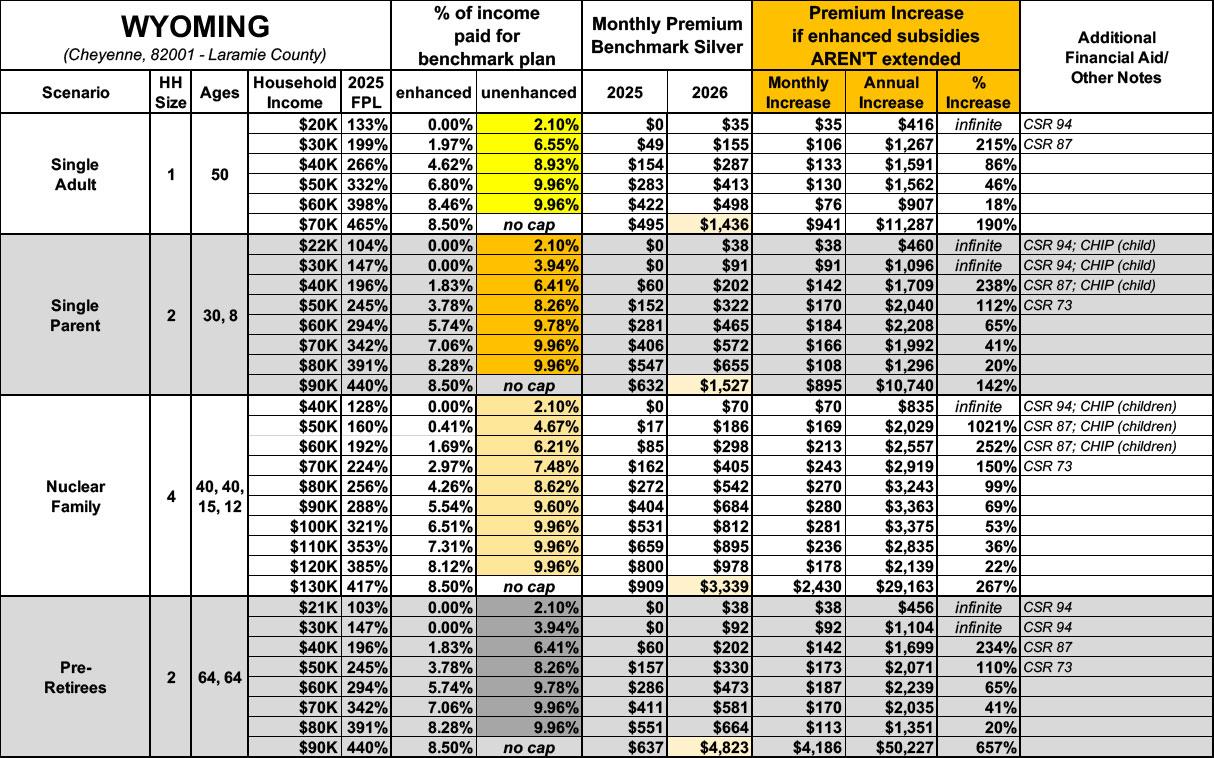 NEW: The original version of this analysis included a 4.3% increase in the unsubsidized benchmark plan premium based on a projection by the Congressional Budget Office. However, that was a national average projection which didn’t take into account other factors like increased utilization, medical inflation and so on. This updated version assumes the actual 2026 Wyoming rate filings.