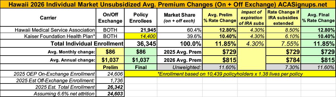 2026 FINAL Gross Rate Changes - Hawaii: +11.9%; Kaiser enrollment higher than I thought
