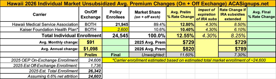 UPDATE 8/28/25: Hawaii carriers have posted their approved filings to the SERFF database. Both filings were approved as is, but the weighted average still dropped slightly due to my underestimating the number of enrollees in Kaiser plans; the approved filing states that there's 10,439 policyholders. Assuming 1.38 lives per policy (that's what HMSA averages), that'd increase Kaiser's enrollment from 2,600 to around 14,400, putting total HI ACA enrollment over 36,000.
