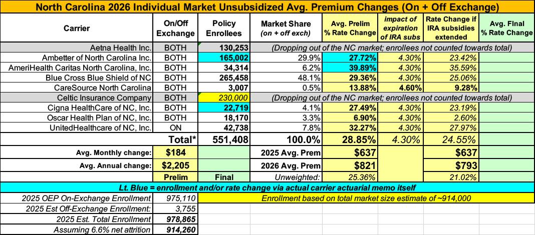 2026 FINAL Gross Rate Changes - North Carolina: +27.8%; what happened to ~263,000 "missing" enrollees?? (updated)