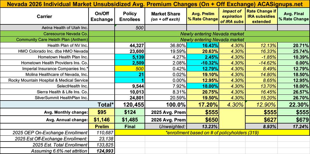 Unfortunately I've only been able to acquire the actual enrollment totals for about half of the NV carriers, but the press release clarifies that the weighted statewide average rate increase is 17.5%. Also, while the total of the 6 carriers with enrollment data add up to 112,404 enrollees, on-exchange enrollment alone as of the end of the 2025 Open Enrollment Period was 110,687, so there are definitely some missing enrollees across the remaining 6 carriers.