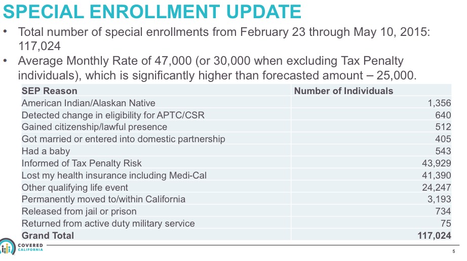 Fortunately, it looks like at least one state exchange has turned the corner, or at least is pretty confident that they're about to: The largest one in the country, Covered California. They just released a report at the Alliance for Health Reform forum; for the most part it's a general overview of CoveredCA's 2015 enrollment situation, rehashing data which was already known (1.3 million currently enrolled, etc.) However, there's a few noteworthy slides which fill out the picture more completely.