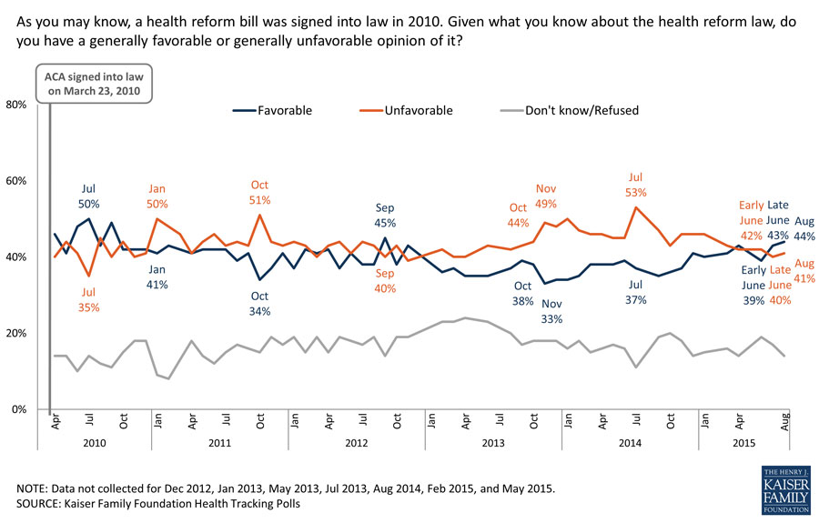 The latest Kaiser Family Foundation tracking poll (considered the gold standards when it comes to national polling on healthcare policy issues) is out, and it's findings aren't terribly surprising to anyone who's been paying attention:
