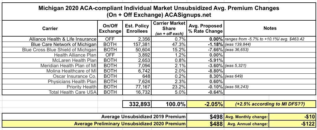 At the time, I concluded that the weighted average change marketwide was a 2.1% reduction in premiums compared to 2019, for around 333,000 Michiganders on the Indy market. This would mean roughly a $10 average premium reduction per unsubsidized enrollee per month, or $122 per year: