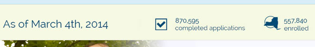 ALBANY (March 10, 2014) – NY State of Health (NYSOH), the State’s official health plan marketplace, reported that as of 9 a.m. today, 908,595 New Yorkers have completed their applications and 590,639 have enrolled for coverage since the launch of the Marketplace on October 1, 2013. More than 70 percent of those who have enrolled to date were uninsured at the time of application. Over the last week alone, enrollment has increased by more than 55,000.