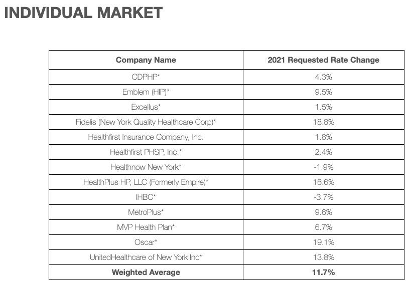 New York is the fifth state (well, fourth really) to announce their preliminary 2021 health insurance policy premium rate changes for the individual and small group markets (thanks to Michael Capaldo for the heads up):