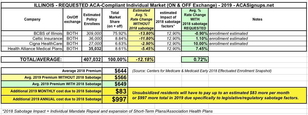 I ran the numbers for Illinois' requested 2019 ACA individual market rate changes back in August. At the time, the weighted year-over-year average was a mere 0.7% increase, with Cigna and Health Alliance's 10% and 7.5% being mostly cancelled out by Celtic's 1.1% and especially Blue Cross Blue Shield's slight drop of 0.9%. Since BCBSIL holds something like 3/4 of the state's individual market share, that alone mostly wiped out the other increases.