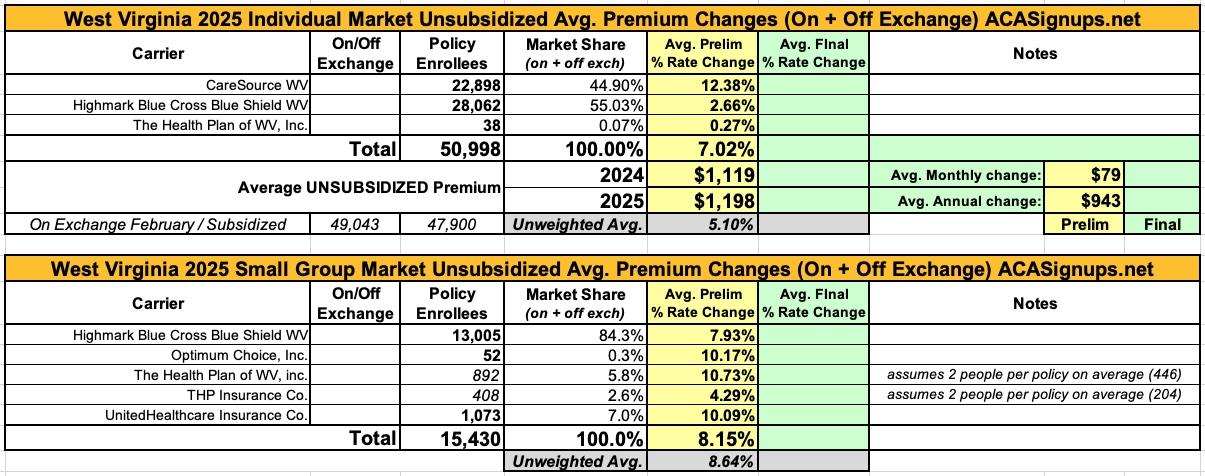 The bad news is that West Virginia already has by far the highest unsubsidized individual market rates in the nation, at nearly $1,200 per month (second highest this year is Wyoming at $965/month).