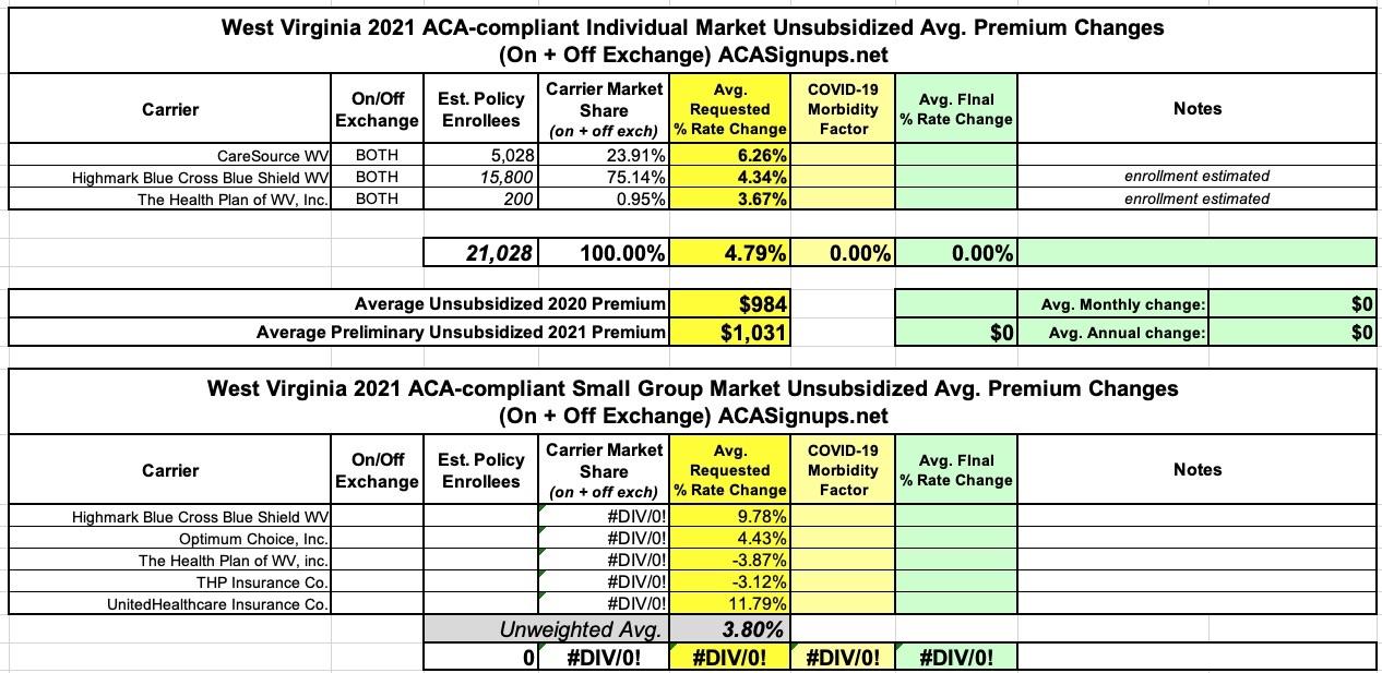 I have no idea what the enrollment numbers are for WV's small group carriers, so I can't run a weighted average, but the unweighted average increase for 2021 comes in at around 3.8% across the five sm. group carriers: