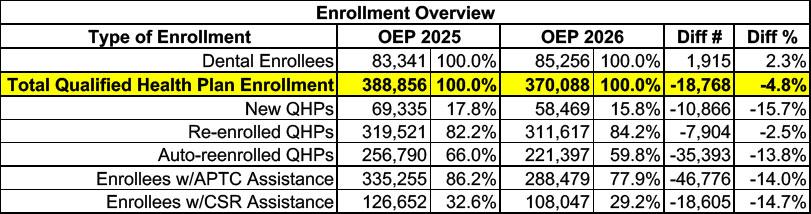 Here's the overview of Virginia ACA exchange enrollment over the course of OEP 2026 vs. 2025. Stand-alone dental plan enrollment is up 2.3%, which is nice, but overall major medical plan (Qualified Health Plan, or QHP) enrollment dropped by nearly 19,000 people, or 4.8% year over year.